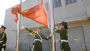 在升國旗儀式莊嚴(yán)的氛圍中,全體人員肅穆立正,行注目禮。